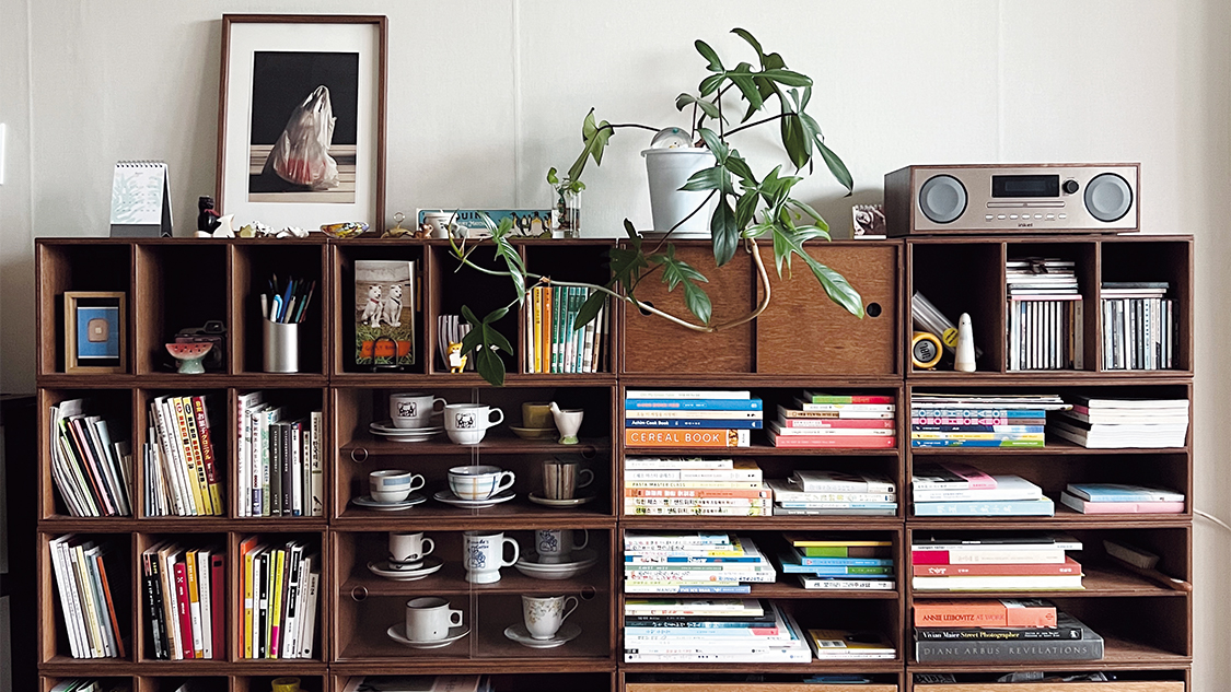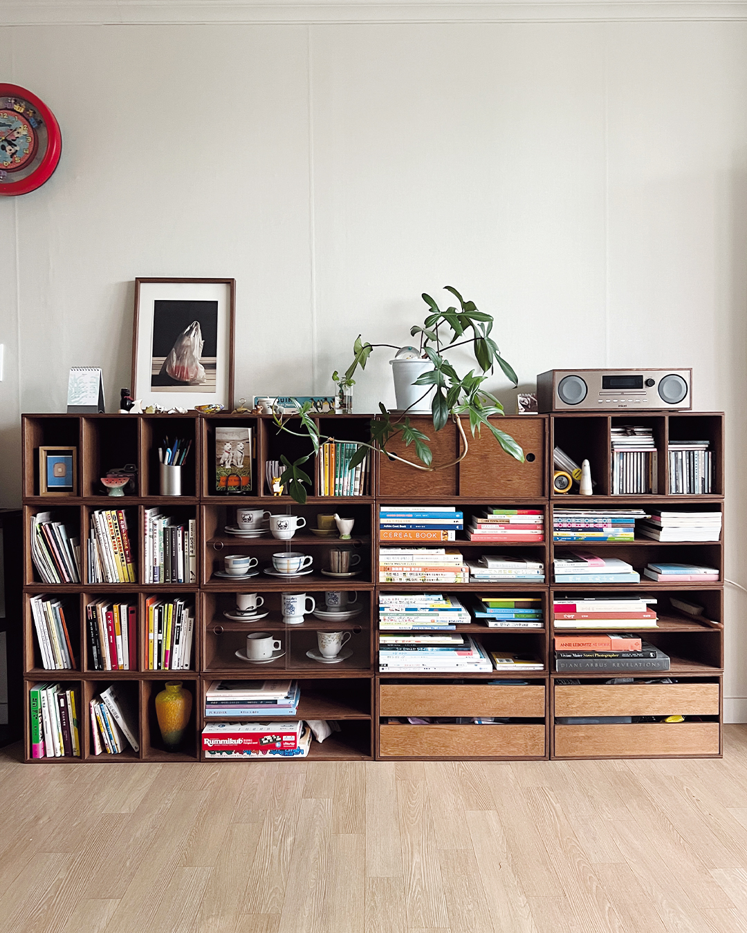 손님맞이 책장. 요리 준비가 한창일 때 “집 구경 좀 하고 계세요” 할 수 있도록 거실 책장에 사진집, 그림책, 요리책, 잡지, 독립출판물 등을 모아뒀다.