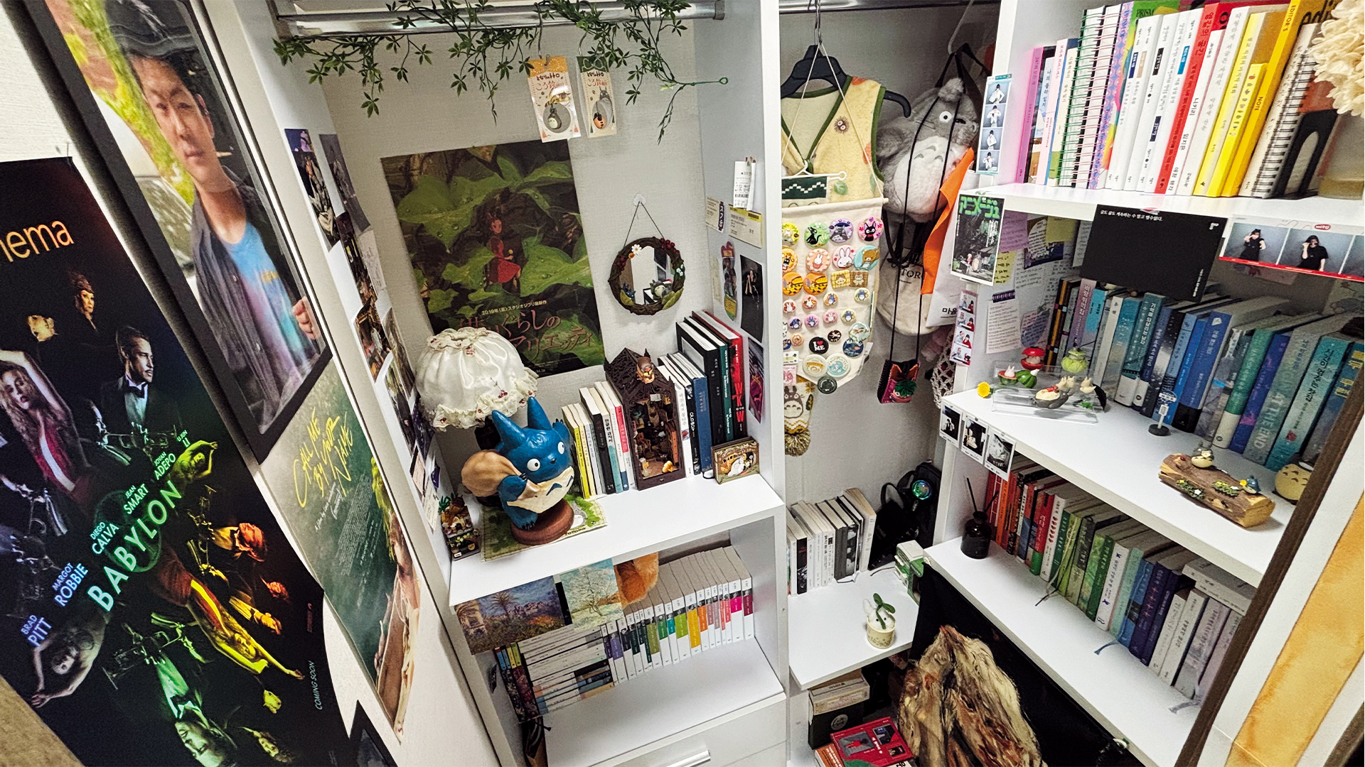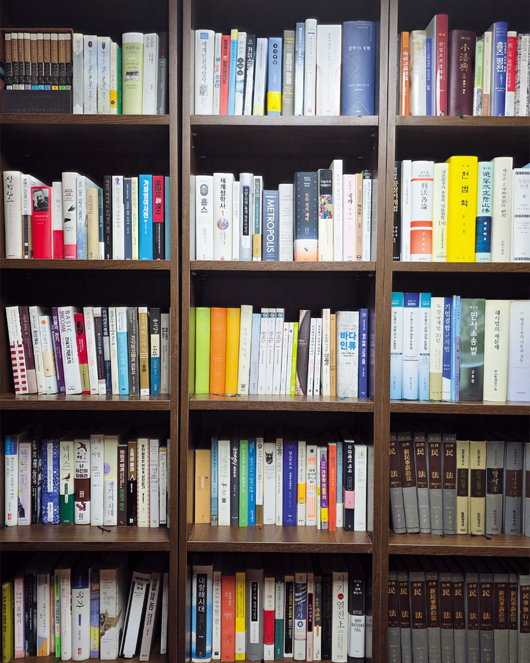 옷방에서 책방으로 재탄생한 공간. 박찬욱 감독의 각본집과 아카이브, 사진집 등 불이 난다면 가장 먼저 들고 나올 보물 같은 책으로 가득하다. 그 아래에는 민음사와 현대문학 출판사 책들이 꽂혀 있고, 오른쪽에는 색깔별로 정리된 책들이 놓여 있다.