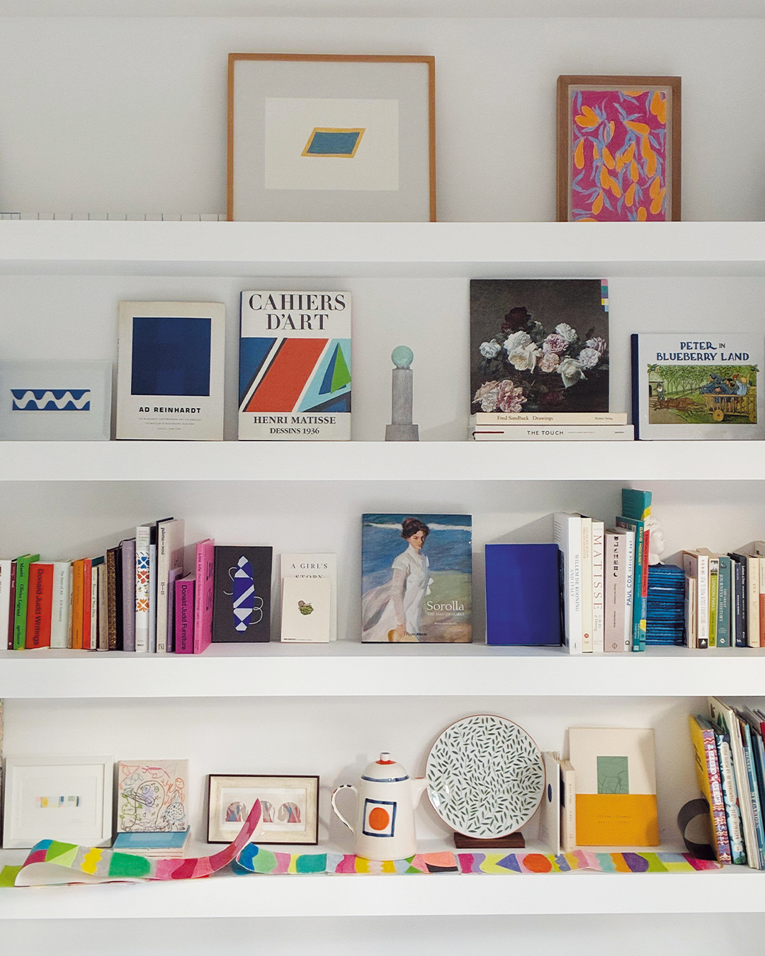 눈이 즐거운 책장. 1층 공간의 가장 큰 벽 전체를 차지하는 책장에 책과 어울리는 오브제, 작품들을 함께 배치해 시각적으로 흥미롭고 아름답게 꾸몄다.
