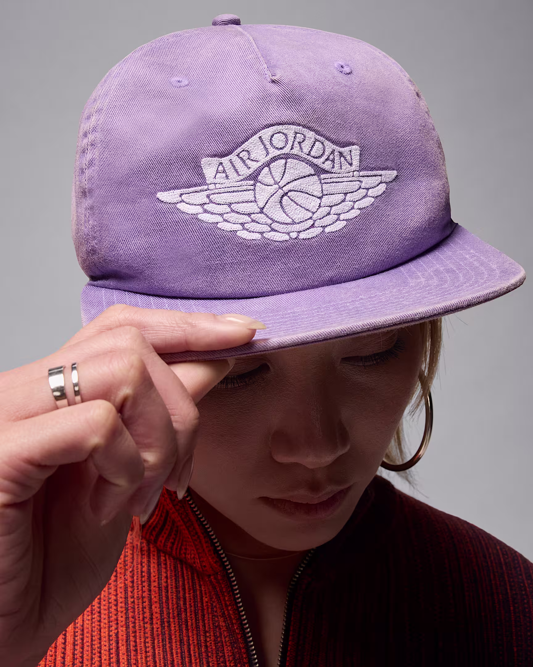 클래식한 야구 모자 실루엣이지만 눈에 띄는 컬러로 포인트를 준 나이키의 조던 레어 에어 콜렉션 스냅백. 워칭 처리한 코튼 소재, 자수로 수놓은 그래픽으로 빈티지함을 더했다.