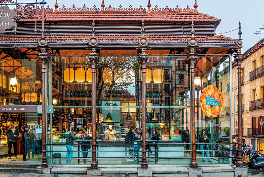 스페인 마드리드의 메르카도 데 산 미겔(Mercado de San Miguel)은 1916년 철골과 유리 구조로 세워진 전통시장이다. 오랫동안 주민들의 생활 장터로 기능했으나 20세기 후반 쇠락을 겪은 뒤 2009년 레노베이션을 마치고 새롭게 문을 열었다. 외형은 그대로 두되 내부는 장 보는 공간을 넘어 먹고 마시는 경험에 집중하도록 바꾸었다. 테이블 좌석보다 스탠딩 바가 중심을 이루며 이베리코 하몽과 올리브, 타파스, 파에야 등 스페인 각지의 미식을 선보인다. 낮에는 관광객들로 붐비고, 밤이 되면 자정까지 문을 여는 스탠드 앞에서 현지인들이 와인 잔을 기울이며 사교의 무대를 만든다. 이곳은 전통시장이 ‘가스트로노미 센터’로 전환된 대표 사례이자 마드리드의 미식을 집약한 랜드마크다.