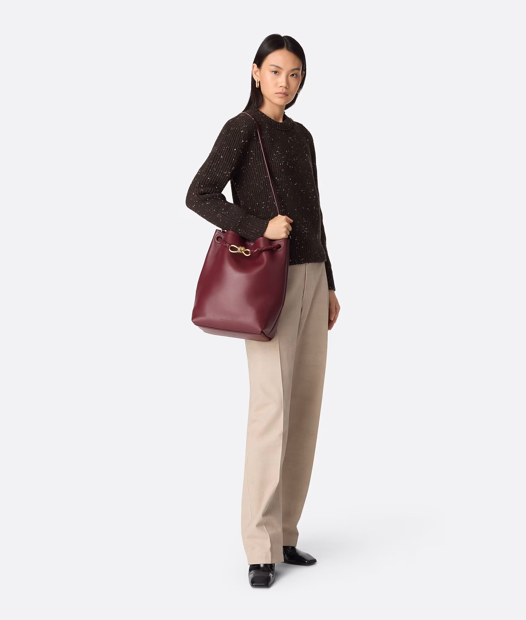 부드러운 송아지 가죽으로 만든 이번 시즌의 신상 안디아모 버킷 백. 브랜드 시그니처의 노트 디테일이 특징이며 숄더 또는 토트로 연출할 수 있다. 774만원.