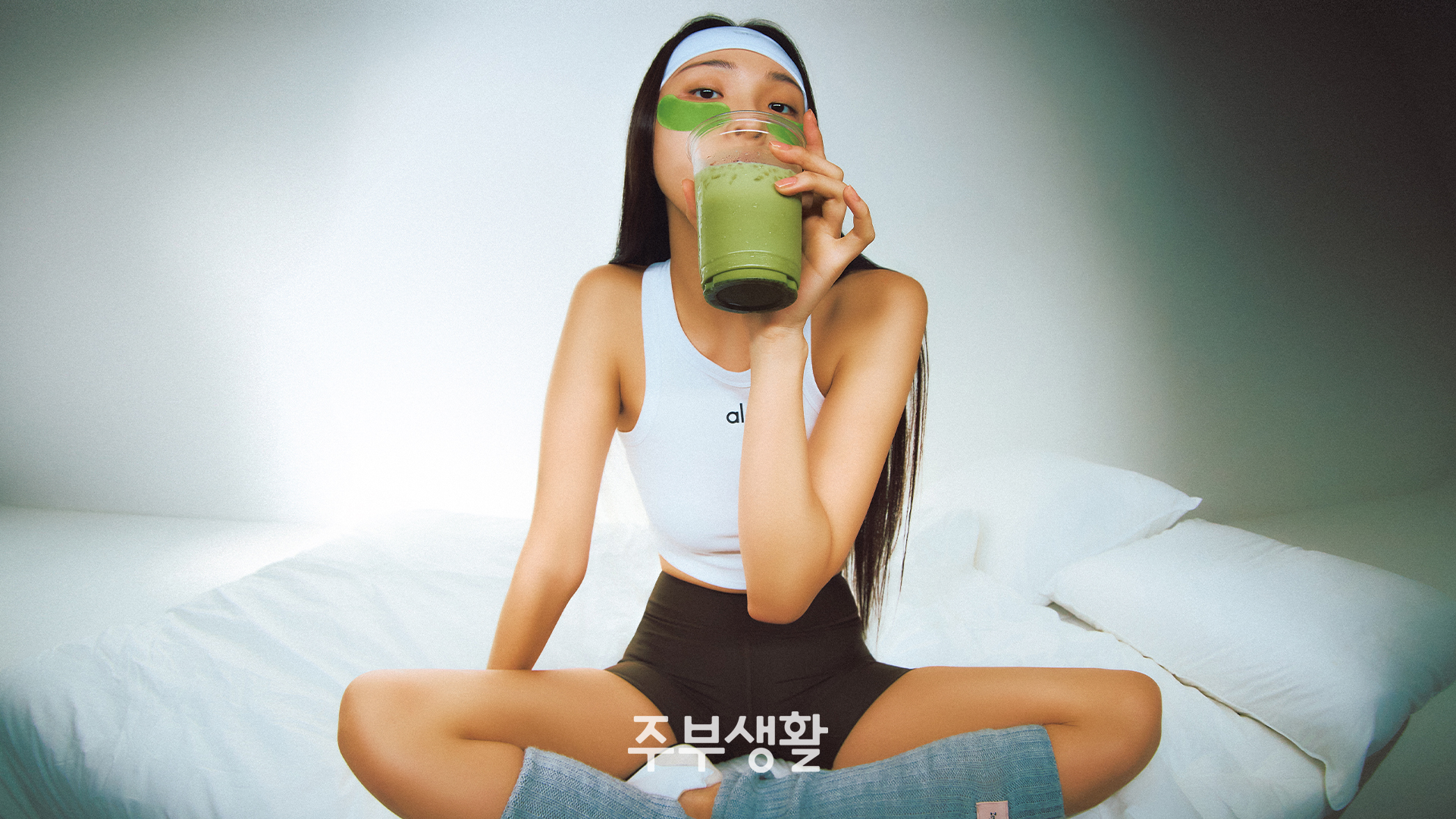 화이트 탱크톱, 몸을 탄탄하게 잡아주는 에어리프트 소재의 바이커 쇼츠, 뛰어난 통기성을 자랑하는 헤드밴드 모두 알로