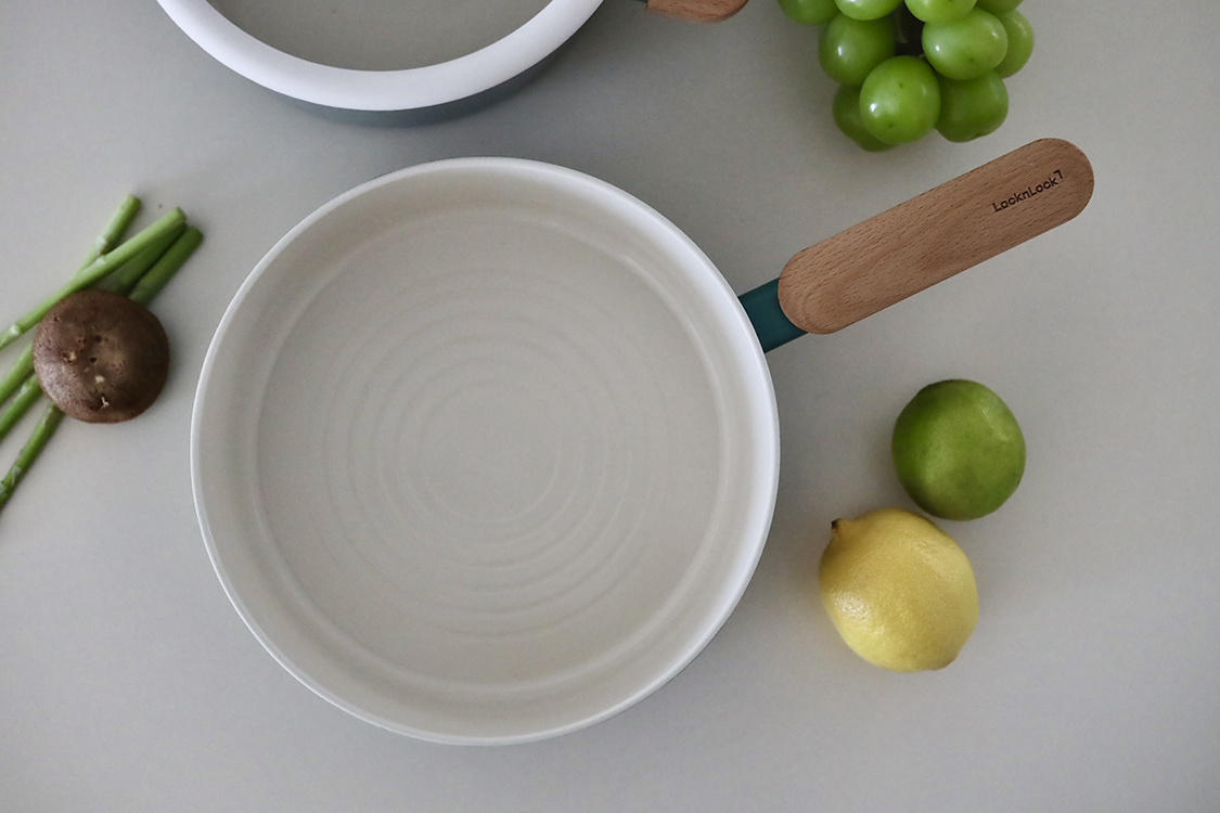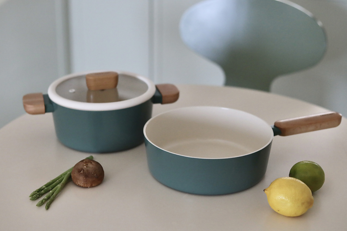 그린 계열의 세이지 컬러와 우드 핸들 조합은 주방은 물론 테이블 위에서도 존재감을 발휘하는데요. 조리 후 굳이 옮겨 담지 않고 그대로 식탁에 올려도 플레이팅이 완성됩니다.