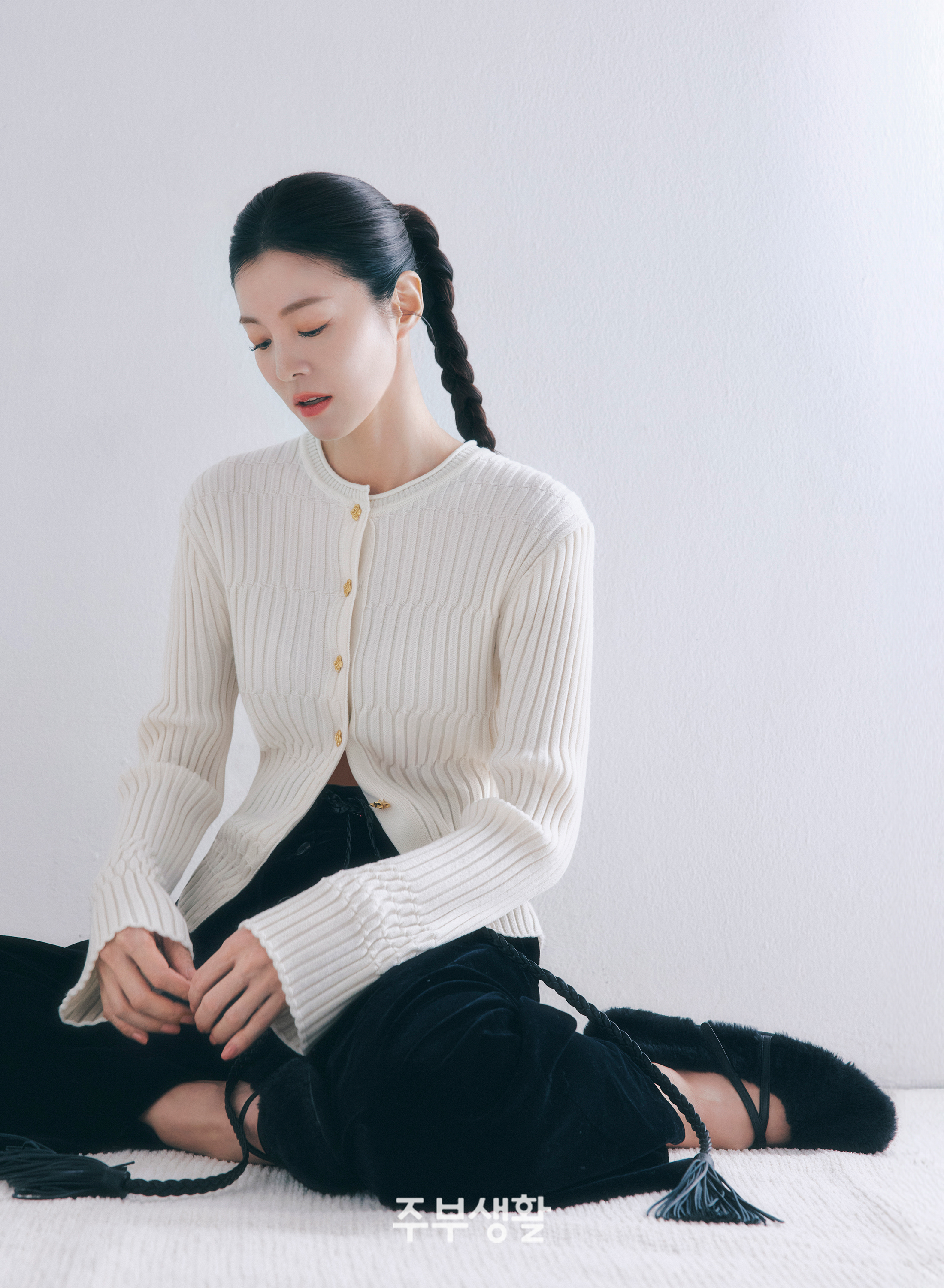 리브 니트 카디건, 벨벳 팬츠 모두 EENK 퍼 메리제인 슈즈 ROH SEOUL지난해 예능 프로그램 출연 이후 ‘자녀 교육 잘하는 엄마’라는 이미지가 더해졌어요.