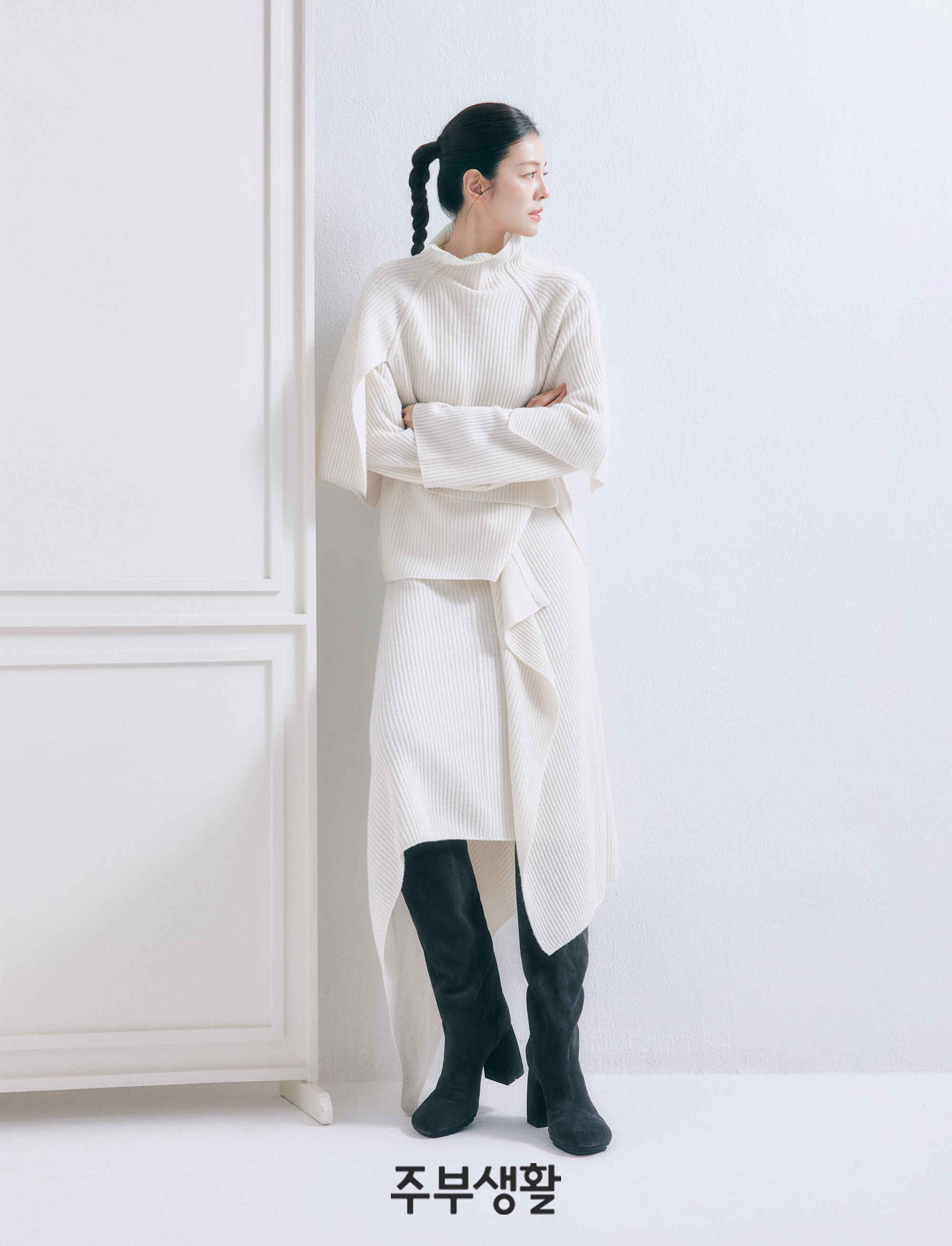 아이보리 니트 톱, 하이넥 케이프, 니트 미디스커트 모두 EENK 롱부츠 ASH아이들에게서 자신의 모습을 발견하는 순간은 언제인가요?