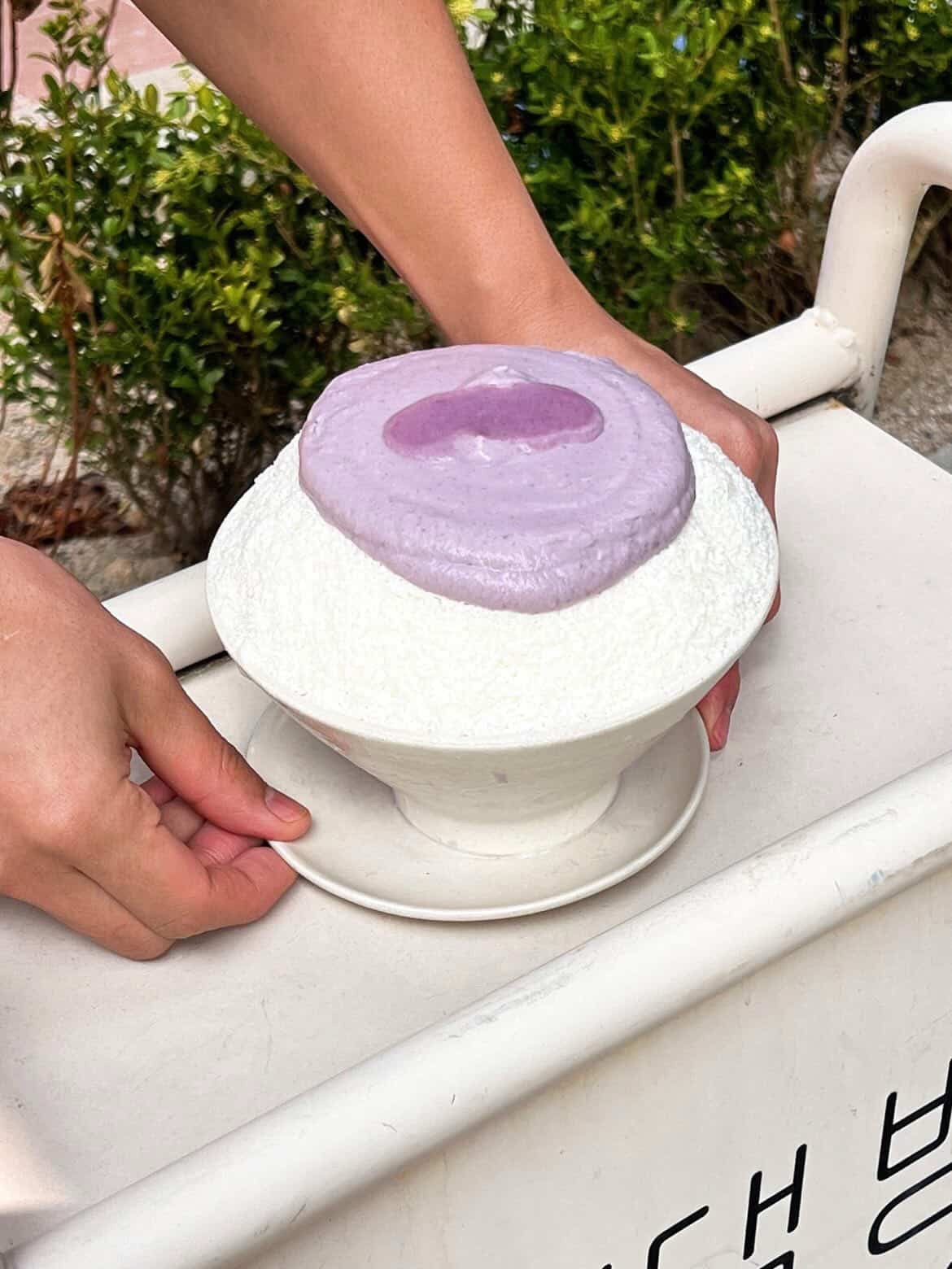 무언가를 더하고 합쳐 화려하게 만들기보다 덜어냄을 선택한 우베 빙수. 포슬한 우유 얼음에 우베 연유, 우베 크림, 바삭한 크럼블과 마카다미아 프랄린으로 다채로운 식감을 살렸다. 은은한 단맛으로 우아함까지 지키며 절제의 미학을 보여주는 빙수다.
