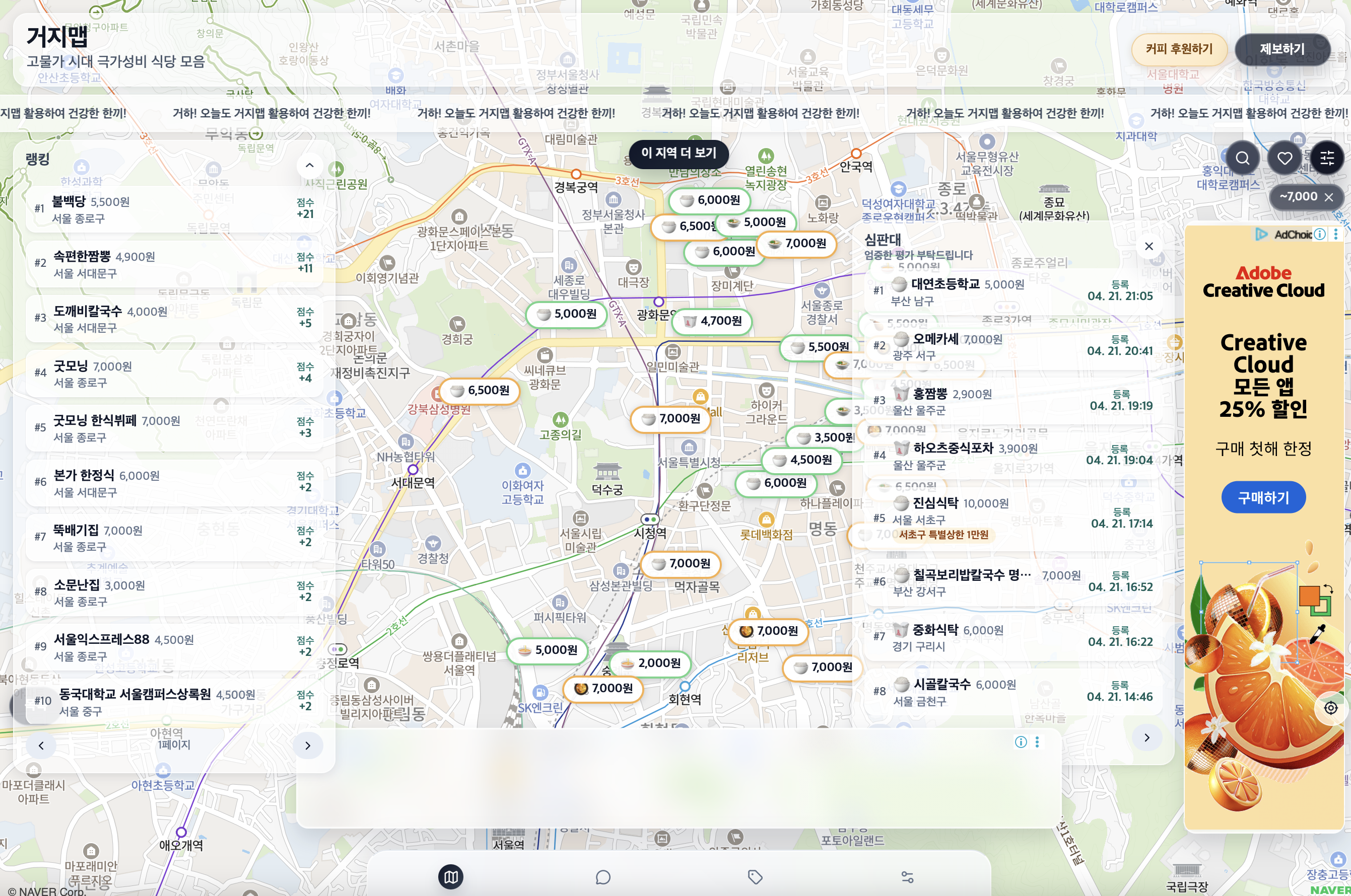 고물가 시대, 극가성비 식당을 알려주는 맵이다. 8000원 이하의 가성비 식당들을 공개하고 있다. 공개 한달만에 누적 방문수 130만 명을 달성하며 지금 가장 핫한 서비스 중 하나로 등극했다. 사내 구조조정으로 직장을 잃고 식비 절약을 실천하던 생활에서 아이디어를 얻었다고.