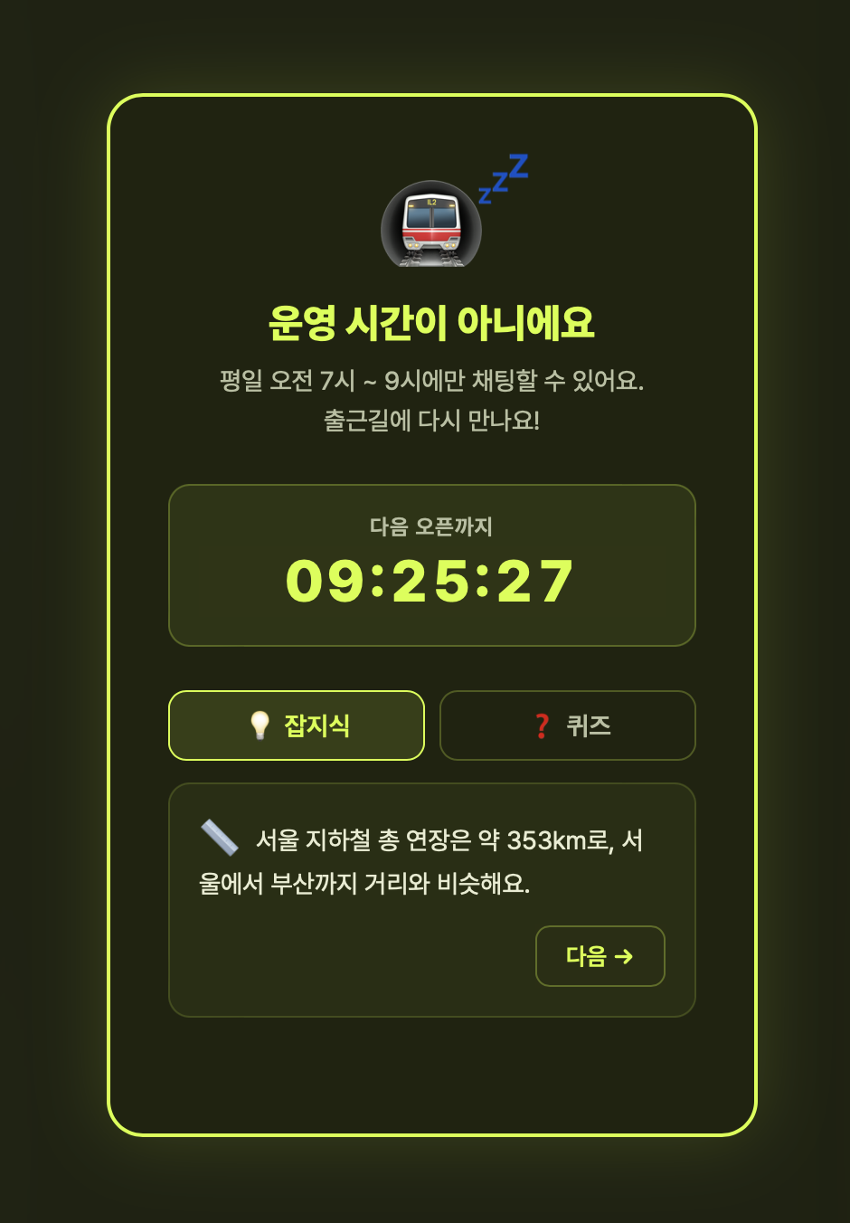 하루에 단 2시간, 평일 오전 7시부터 9시까지만 열리는 온라인 익명 채팅방이다. 지긋지긋한 만원 지하철 안에서 누구라도 연결된 기분을 느끼고 싶은 직장인들에게 인기다. 어쩌면 머리는 '가기싫어!'를 외치지만 몸은 저절로 출근하고 있는 현대인들을 위로하는 블랙코미디일지도.